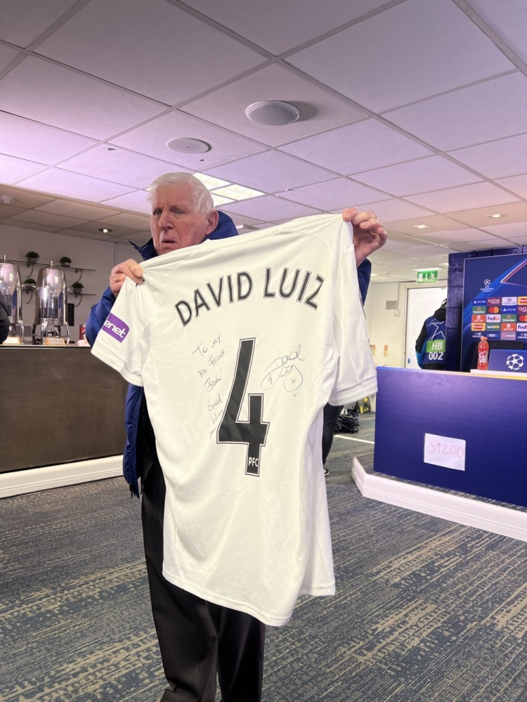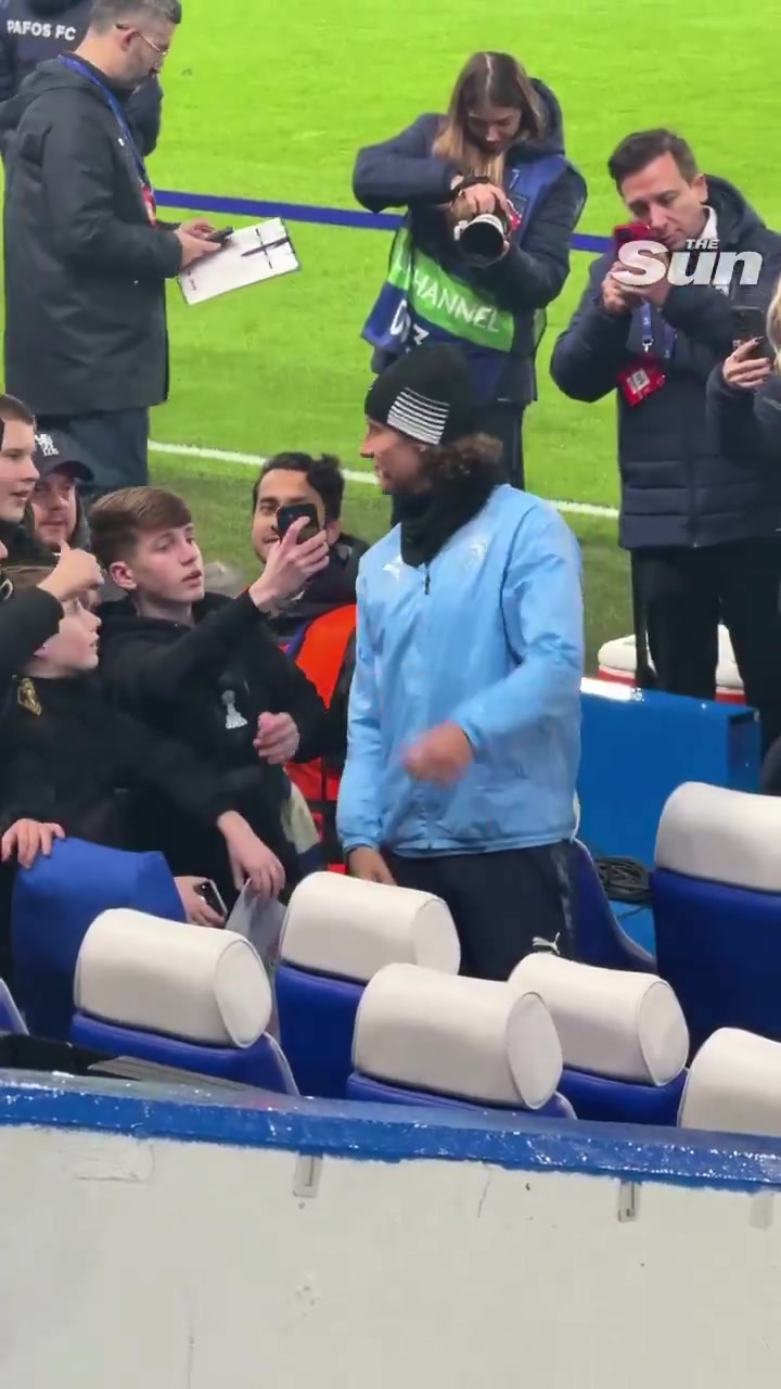 切尔西旧将大卫·路易斯随帕福斯重返斯坦福桥,此役担任替补没有出场,他与切尔西球迷合影,并将自己的签名球衣赠送给切尔西老员工普尔曼。